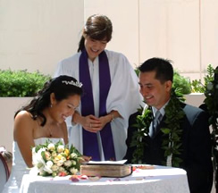 挙式を執り行うのは、ハワイはもちろん、日本のメディ アでも活躍中のセレブ、アリス・イノウエ。ホノルル・チャーチ・オブ・ ライトの司祭としても活躍している彼女は、ハワイ州公認の結婚 取り扱い資格を所有しており、ロコだけでなく、アメリカ本土や、 日本からのカップルも、アリスの手でたくさん式を挙げています。挙式のスタイルは、いろいろで、クリスチャン、スピリチュアル、宗教的ではない人前式など、リクエストに応じて対応。英語はもちろんのこと、日本語、中国語での挙式も可能。明るい笑顔と、温かな人柄のにじみ出るアリスの挙式は、定評があります。