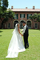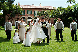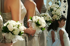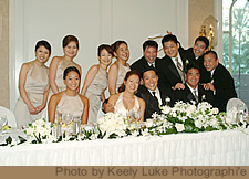 新郎新婦だけが、正面に座る日本の披露宴とは異なり、両脇にブライダルパーティが並んで座るのが欧米では一般的。親しい友達や、家族(姉妹や兄弟、いとこなどが、ブライダルパーティをつとめることはよくありますが、この場合、両親などは含まれません。)と一緒にお祝いをするという感じが、前面に出て、とても素敵な光景です。